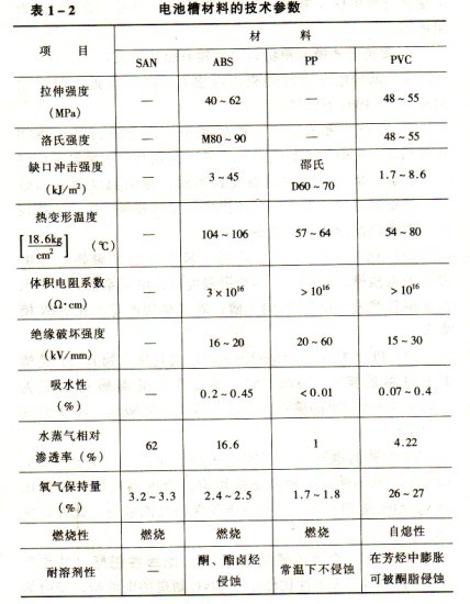 (2)ABS(丙烯腈、丁乙烯、苯乙烯的共聚物)。ABS制成的電池槽,硬度大,熱變形溫度高,電阻系數大。但水汽泄漏較嚴重,稍好于SAN槽;氧氣滲透嚴重,比SAN槽要差。