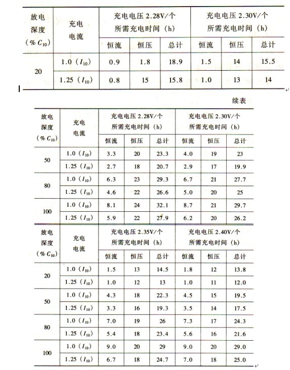 初充電一浮充電一均衡充電是按下列程序循環進行的。在投運前,對電池進行初充電,此時用恒流為l.Oll0進行充電。當單體電池電壓上升到2.35V轉為恒壓充電,此時充電流逐漸減少,然后轉為正常運行狀態即浮充電壓為2.25V。當運行720h后,進行均衡充電,即先以恒流l.Ollo電池充電,至電池電壓為2.35V轉為恒壓充電,電壓恒定一段時間又轉為正常浮充狀態。當交流電源中斷后,此時自動 進行均衡充電,以恒流l.Ol】o充電。電池電壓上升至2.35V后和上述運行初充后均衡充電的過程相同。上述兩階段充電,其浮充轉均充的判斷大多采用時間來整定,即不論放電幅度如何,一日由恒流階段轉入恒壓階段后,延時若干個小時,則自動轉為浮充。實際情況是充電所需時間與放電幅度有關,如圖3-1所示。因此事故放電的深度是隨機的,若用一個固定的時間來操作,則有可能造成電池的過充或欠充,所以采用蓄電池回路的充電電流作為均充終期的判據是較合理的。不同放電深度后充電的所需時間見表3-1。表3-1 不同放電深度后充電所需時間