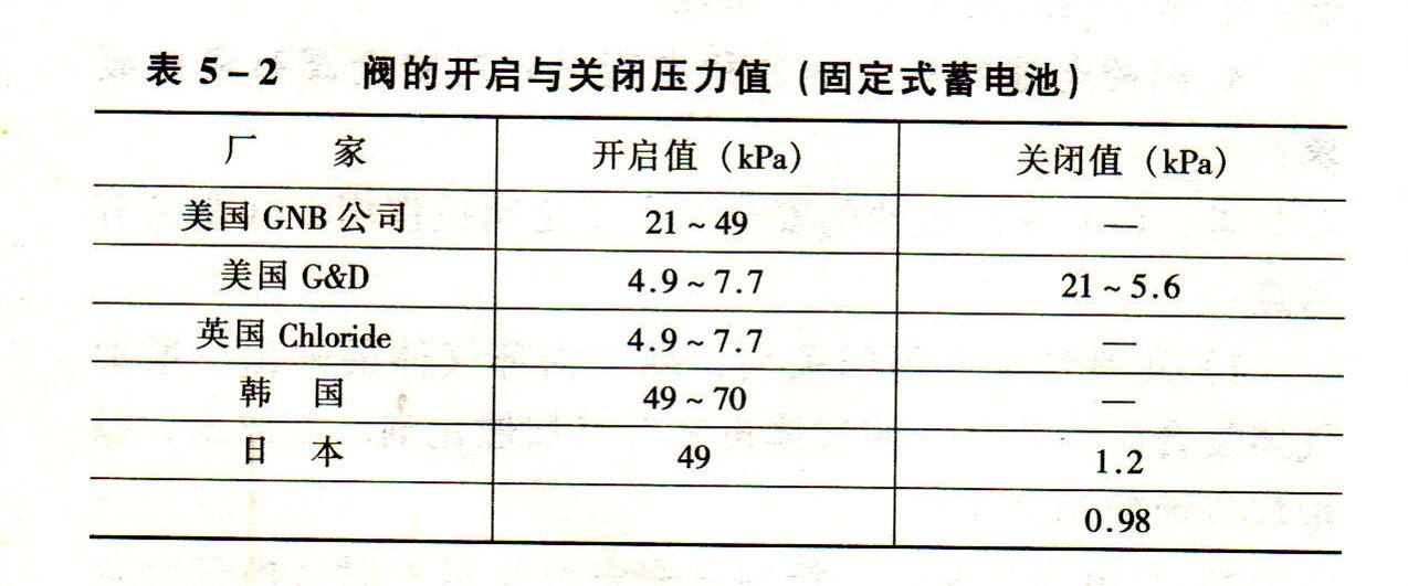 制造閥控式密封蓄電池的不同廠家,根據電池的性能、殼體材料和電池運行條件,設置不同的開啟壓力和關閉壓力。現列出了幾家電池公司所設置的閥的開啟和關閉壓力值。