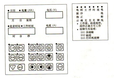 4)打印:在手動(dòng)打印方式下,按一該鍵,指示燈亮后,打印機(jī)將打印一次當(dāng)前充電機(jī)的工作狀況及有關(guān)參數(shù);