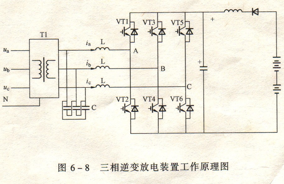 三相交流輸出,采用三相高頻PWM整流逆變電路,一方面控制蓄電池恒流放電,另一方面將蓄電池釋放的能量反饋回電網,并控制流入電網的電流接近正弦波。